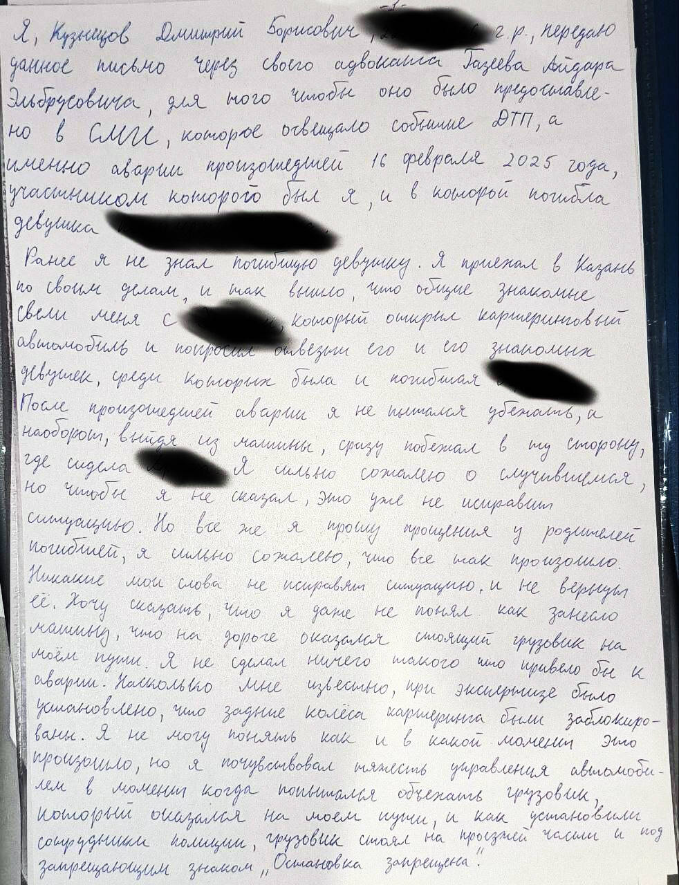 «Я и мои близкие прилагаем все усилия для того, чтобы хотя бы возместить причиненный вред, чтобы хоть как-то попытаться загладить причиненные страдания родителям погибшей. Ещё раз приношу свои глубочайшие соболезнования и извинения перед родителями погибшей девушки, простите меня, пожалуйста, простите за всё», – пишет Дмитрий Кузнецов.