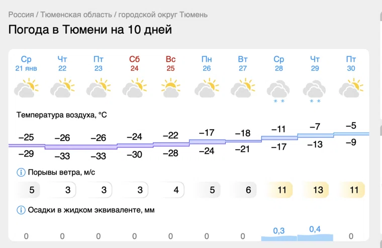 «Ночью 22 и 23 января в Тюмени ожидаются 33-градусные морозы. Днём — до 26 градусов. Осадков не ожидается. Ветер слабый, до трёх метров в секунду», — уточнили метеорологи.