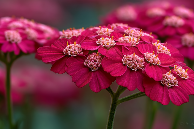 Тысячелистник «Вишневая королева» — это многолетник, который привлекает внимание яркими, насыщенными щитками с розово-вишневыми цветками, собранными в плотные шапки.