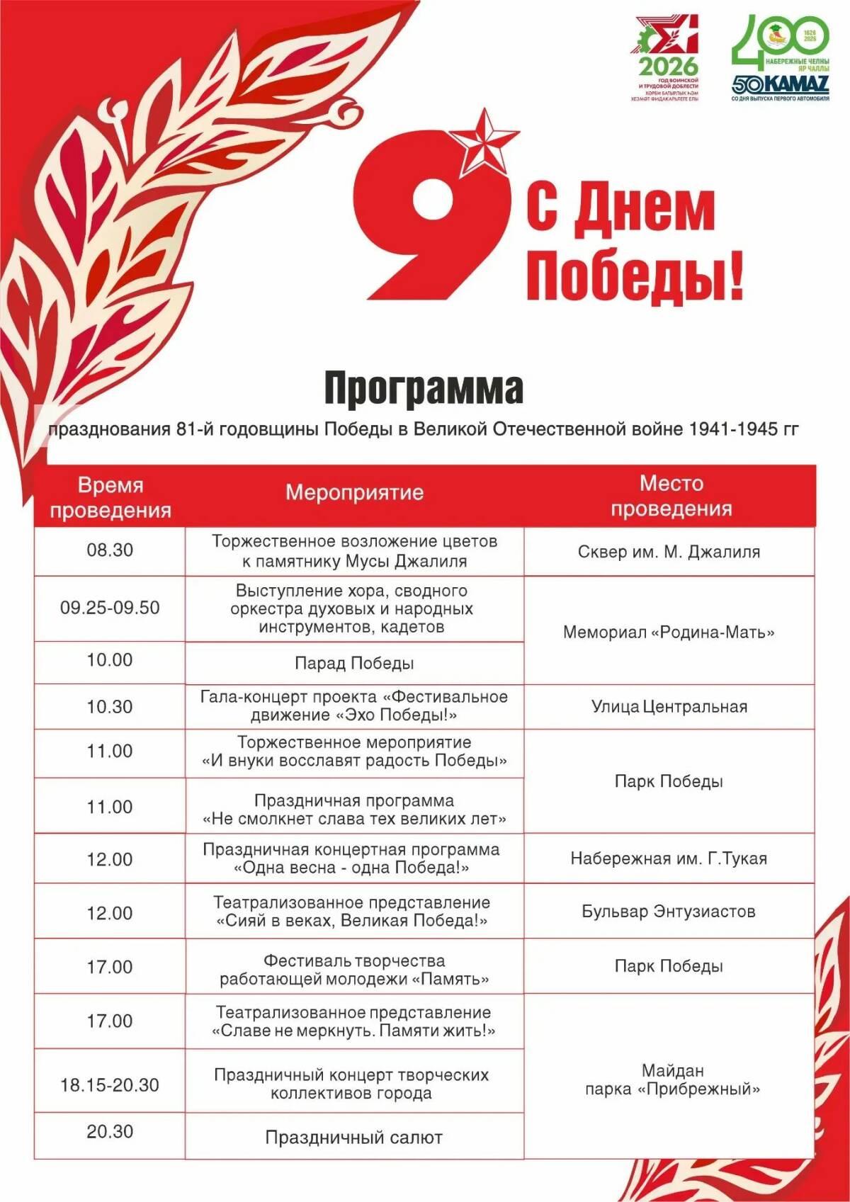 Ключевым событием станет Парад Победы, который начнётся в 10:00 на проспекте Мусы Джалиля у мемориала «Родина-мать». В нём примет участие 41 парадный расчет – это кадетские школы, студенты высших и средних профессиональных учебных заведений, представители «ЮНАРМИИ», движения «Движение Первых», а также ветераны запаса.