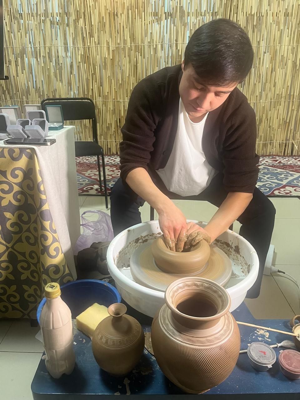 В ходе выставки Данияр Бабашов (Алматы) демонстрировал работу на гончарном станке, Тарбия Айдымбаева (Алматы) показала коллекцию национальной одежды из кашемира с авторскими принтами, а Гульмира Рахматова (Бишкек) представила изделия из мериносовой шерсти: чапаны, головные уборы, аксессуары, изготовленные с использованием традиционных техник.