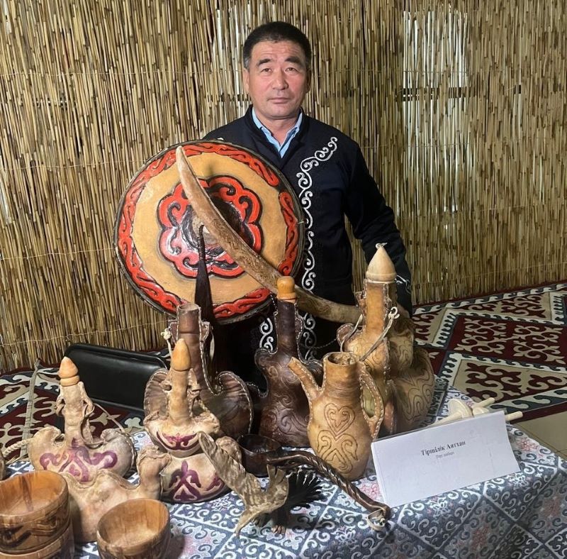 Здесь выставлялись яркие чапаны и головные уборы из войлока и фетра, расписная керамическая посуда, изделия из кожи, образцы военного снаряжения батыров, национальные музыкальные инструменты, деревянная утварь, тканые пояса, традиционные украшения, небольшие сувениры и обереги.